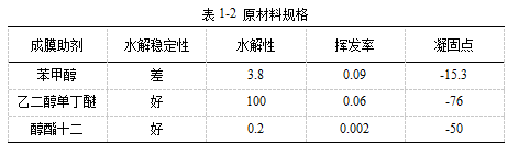 醇酯十二與其它成膜助劑相比較,水溶性小,且容易被乳膠離子吸收,可以直接接觸,更易于對(duì)膠粒的溶脹;醇酯十二的揮發(fā)速度低,成膜前保留在水性漆涂層中,溶劑作用不會(huì)受到水的揮發(fā)影響,成膜的單釜連續(xù)性好;而其又具有適宜的揮發(fā)度,在水性漆成膜后短時(shí)間內(nèi)完全揮發(fā)掉,不會(huì)影響水性漆配方設(shè)計(jì)所預(yù)期的硬度和光澤,如表1-2。