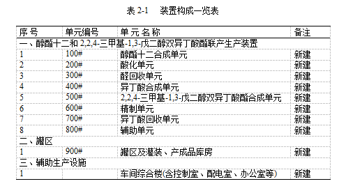 本項(xiàng)目裝置組成包括醇酯十二合成單元、異丁酸合成單元、 2,2,4-三甲基-1,3-戊二醇雙異丁酸酯合成單元、精制單元及輔助生產(chǎn)設(shè)施等部分。
