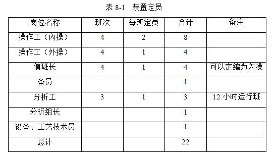 裝置定員不考慮行政管理人員,設備維修維護人員。如果裝置自動化程度設置較高,設備可靠性好,人員可減少。