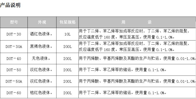 用于丁二烯、苯乙烯等加成等非聚合反應(yīng)時(shí),丁二烯的阻聚,反應(yīng)溫度低于160度。
